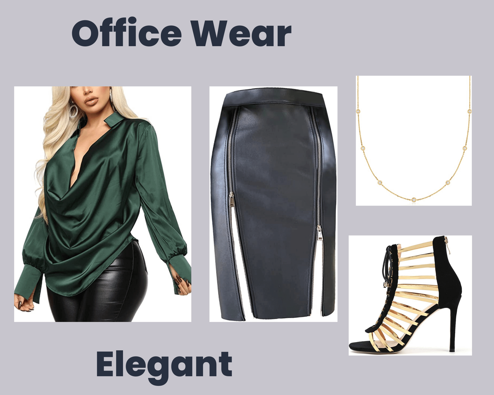 To make a more elegant outfit, you can find this minuet Women's satin green Blouse and combine it with a black leather high-waisted velvet trousers, golden pave and green pearl earrings and black cut out pumps easily available on amazon site.